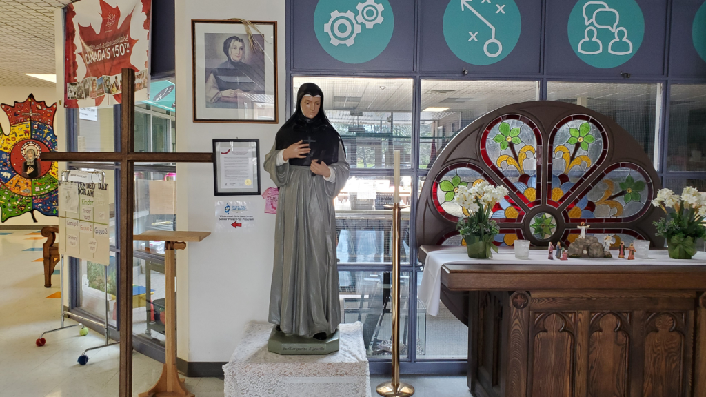 In the school year 2023, the students and staff of St. Marguerite D’Youville were delighted to unveil a new addition to their foyer. A 4-foot statue of St. Marguerite D’Youville, the school’s namesake, now graces the entrance and welcomes all who enter.